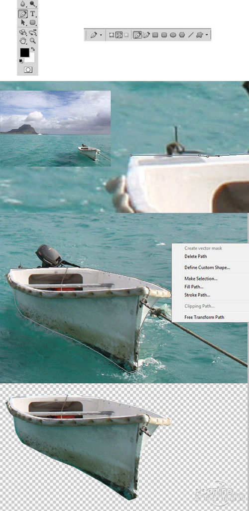 从文档中打开“Boat”素材,然后在工具栏中选择钢笔工具。利用钢笔工具在船只边缘点击增加锚点,下面就沿着船只边缘逐渐增加锚点,知道最后一个锚点 跟第一个锚点重合。接着对着圈定的区域按右键,在弹出菜单中选择建立选区。按Shift+Ctrl+I进行反选,再按Delete将背景删除。以上步骤的 设置如下图所示。