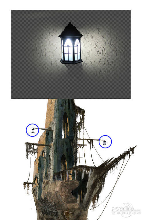 打开“Lamp”素材,再次利用钢笔工具将挂灯抠出。然后复制一个,再船的左右船杆上各挂一个。效果如下图所示。