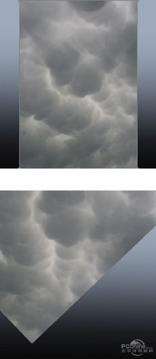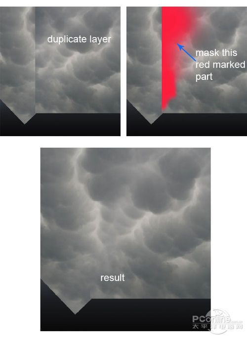 复制乌云素材,然后放置在原来的乌云图层上方,并移放到画布的右边,再用蒙版和笔刷将与原来乌云图层交接的地方遮蔽掉,这里的笔刷要使用软笔刷,让过渡更加自然。绘制提示如下图所示。