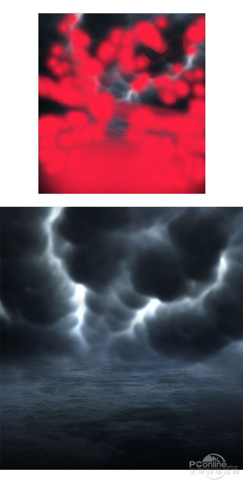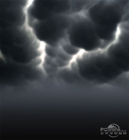 设置乌云图层的图层混合模式为正片叠底,不透明为100%。复制乌云图层四次,将第一个乌云复制图层设置为正片叠底、不透明度100%,第二个乌云复制 图层设置为正片叠底、不透明度80%,第三个设置为叠加、不透明度45%,最后一个设置为颜色加深、不透明度100%。设置后,效果如下图所示。