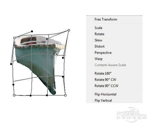 下面再在自由变换菜单中选择变形,然后根据下图和最终效果图调整船身形状。效果如下图所示。