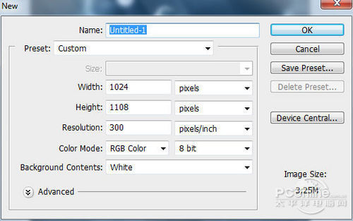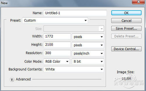 首先按Ctrl+N新建文档,设置画布的长宽分别为2100像素和1772像素。设置如下图所示。