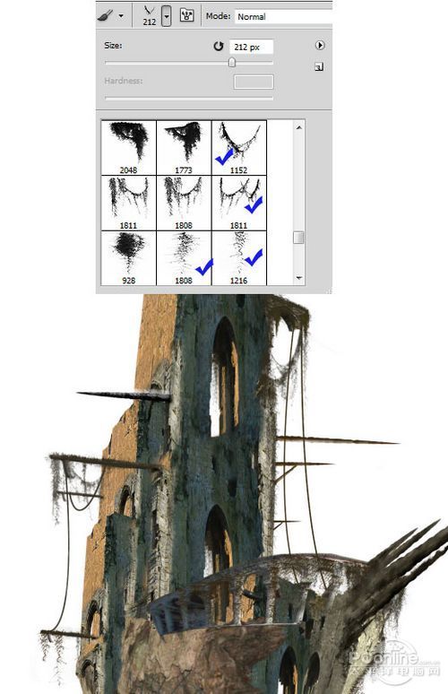 将PS翻译教程提供的海藻笔刷导入到Photoshop。新建图层,用海藻笔刷在船身绘画,笔刷所用颜色为暗调的绿黄色。笔刷选择与绘画效果如下图所示。