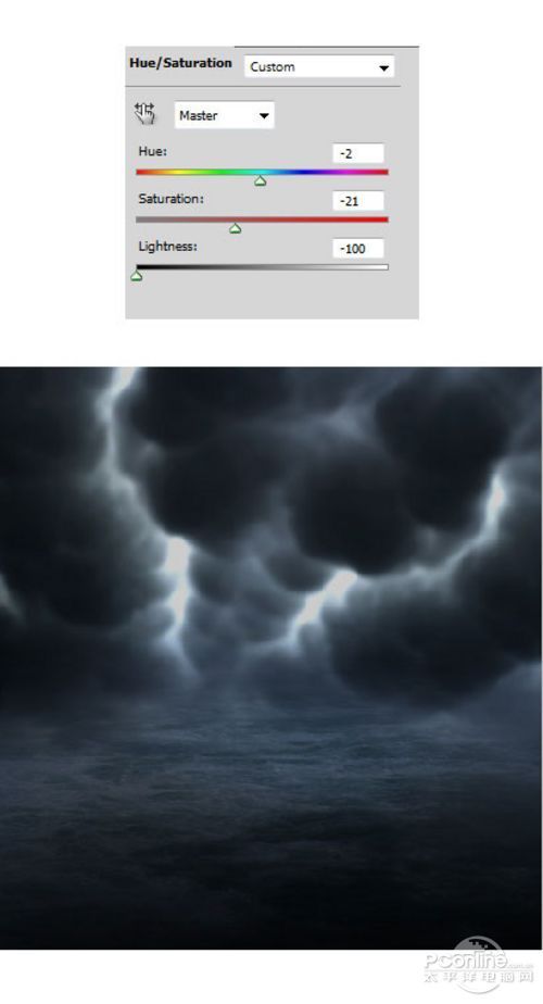 下面要在海水图层的下方添加调整图层,在主菜单中选择“图层>新调整图层>色相/饱和度”,设置色相-2、饱和度-21、明度-100。详细设置如下图所示。