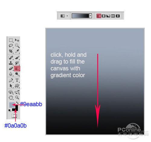 在工具面板中选择渐变工具,然后设置前景色为#9eaabb、背景色为#0a0a0b,接着选择线性渐变。如下图所示的箭头方向,往下拖动鼠标,将整个画布填充。效果如下图所示。