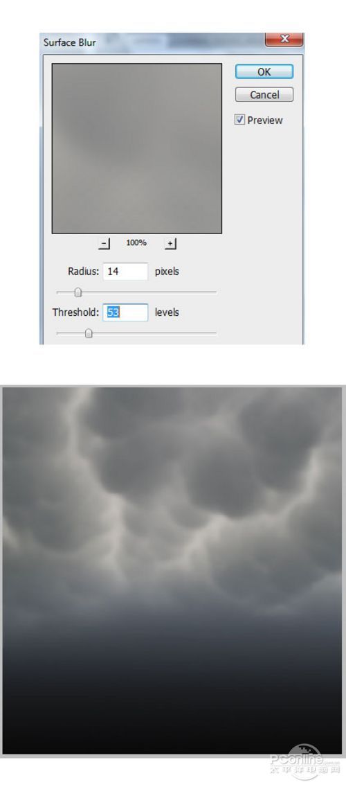 继续选择乌云图层,在菜单栏中选择“滤镜>模糊>表面模糊”,令乌云看起来更柔和,这样就让乌云跟场景中的其他物体区别开来,形成空间感。设置表明模糊,半径14像素、阀值53色阶。详细设置如下图所示。
