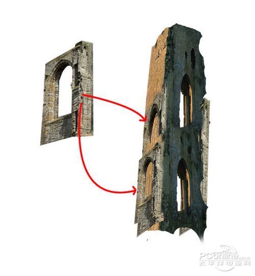 将裁剪出来“Tower”素材复制几份出来,利用自由变换工具将这些素材贴到墙体上,再用图层蒙版工具将素材的边缘处理一下,让墙体看起来更加完整一体。效果如下图所示。