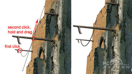 这一步要增加一些船用绳索。按Shift+Ctrl+N新建图层,再选取钢 笔工具。在新建图层中,如下图所示在两个铁杆上点击增加锚点,然后往红色箭头方向拖动第二个锚点,这样就能形成弧形线条,如下坠的绳子。接着设置画笔为高 硬度,直径2-3像素,前景色为棕黑色。设置好画笔后,对着刚才绘制的线条右击,在弹出菜单中选择描绘路径,然后选择画笔作为描绘工具,勾选模拟压力。效 果如下图所示。