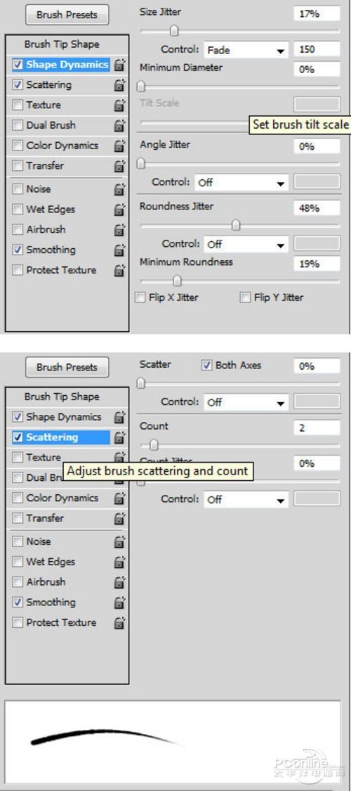 在这一步中,继续绘制更加多的船杆。选择画笔工具,然后选择硬度较高的画笔类型,然后如下图所示,打开画笔属性面板,勾选动态形状,设置大小抖动17%、控制渐隐150、圆度抖动48%、最小圆度19%。继续勾选散布,设置数量为2,其余默认。