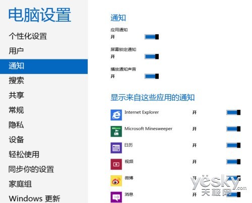 在这里我们可以看到所有Win8应用通知的总开关以及锁屏通知和通知声音的开启与关闭,下方则是当前Win8系统中所有具有通知功能的应用列表,我们可以在这里统一设置每个应用通知的开关。