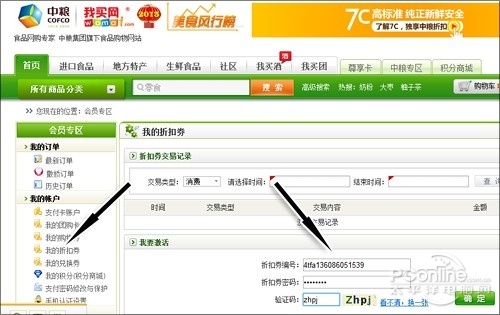 以“中粮我买网”为例,登录后点击“我的折扣券”,然后将上图中折扣券编号密码录入其中,点击确定完成激活(图7)。