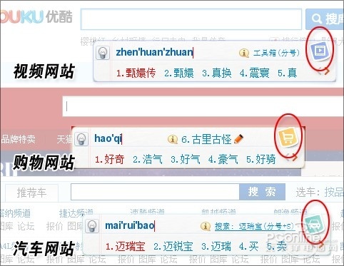 “变色龙”是搜狗拼音智慧版2.0的另一个看点,所谓变色龙,其实并没有想像中那般神奇,因此官方也没有对其进行过更详细介绍。通俗来讲就是当你在某专 业网站(比如视频网站、购物网站、体育网站等)输入关键字时,由输入法自动感知网站类型,并将原有的搜狗图标替换成对应的网站标识。换句话说,所谓的“变 色”其实不过就是换换图标而已,并没有太多实际意义。
