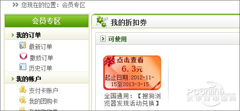这时“我的折扣券”里就出现了一张可用折扣券,金额为6.3元,时间截止至2013年3月15日(图8)。