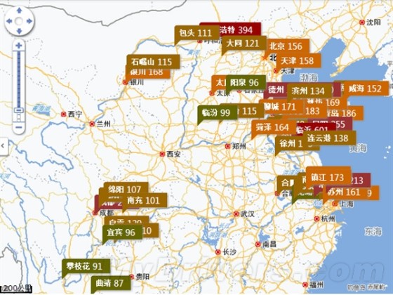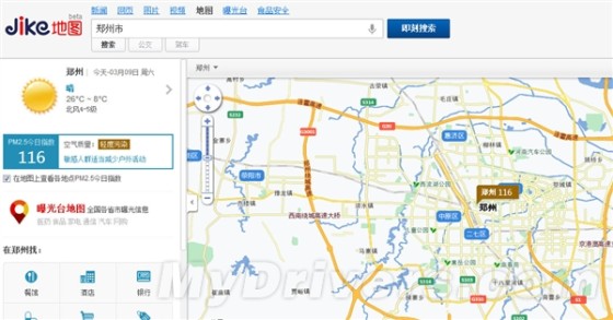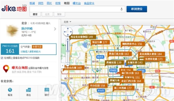 谁说即刻没有创新,作为人民网旗下的搜索,即刻搜索(jike.com)还是挺有中国特色的。就大家近日比较关心的空气质量问题,即刻搜索就推出了PM2.5地图,勾选上左侧的“在地图上查看各地点PM2.5今日指数”,你可以实时看到全国各地的PM2.5指数。