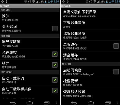 在酷狗音乐Android版的设置中,还有线控、自定义音乐下载目录以及音质选择等等,用户可以根据自己的选择进行设置。