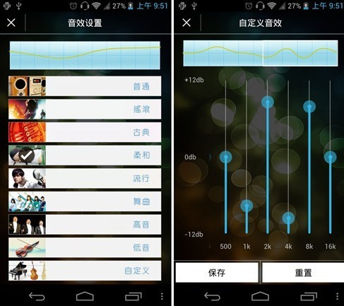 作为一个“朝三暮四”音乐爱好者,大多数人喜欢的曲风会经常变化,而且不同的歌曲对音效设置也有不同的需要。在酷狗音乐Android版中,它就提供了近10种主要的音效预设,而对于有更高要求的用户,还可以通过微调进行个性化音效设置。