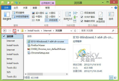 Ribbon工具栏下方提供有后退、前进、上一级、文件路径框以及搜索框,点选前进右边的小三角按钮还可以从下拉菜单中查看并选择浏览位置历史。