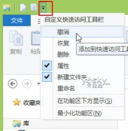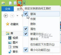 Win8文件资源管理器界面的左上角区域是快速访问工具栏,里面包含撤销、恢复、删除、属性、新建文件夹、重命名等选项,我们点击自定义快速访问工具栏按钮右边的小三角图标,可以从下拉列表中选择需要的常用功能按钮添加到快速访问工具栏中。