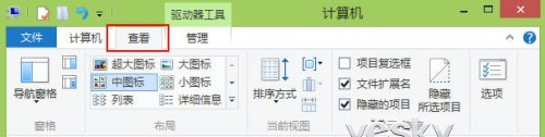 图示:Win8文件资源管理器“驱动器工具”分类中的“查看”选项卡