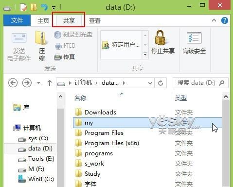 当我们选择某个分区、文件夹或者文件时,可以在“共享”选项卡中看到发送电子邮件、压缩、刻录、打印、传真、共享、安全设置等等功能按钮。