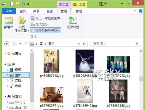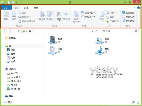 图示:Win8文件资源管理器Ribbon界面,缺省显示“库”分类