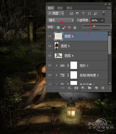 完成后将图层的混合模式设置为“强光”并将不透明度设置为你40%,得到如下效果