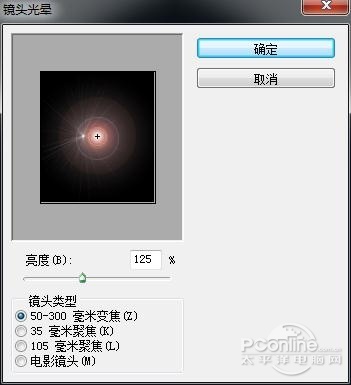新建一个图层,填充为黑色,选择“滤镜>渲染>镜头光晕”,并如下设置,将混合模式设置为“滤色”