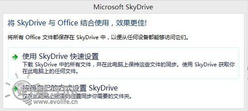 顺带一提,系统会提示是否要将所有的Office文件保存在SkyDrive中、还是仅同步所需位置的文件夹,目的都是从任何设备访问它们。我个人的习惯是,仅同步指定位置的文件夹,也就是只同步那些工作文件。