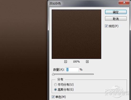 完成后我们在选择菜单中的“滤镜>杂色>添加杂色”,在弹出的对话框中设置数量为1,选择“高斯分布”