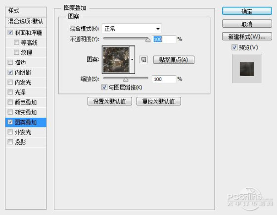 图案叠加:这里要载入“大理石”纹理图案,如果你需要这个纹理可以问题群中索取“72128648”。注:图案载入,点击图案略缩图旁边的下拉菜单,在 弹出的图案预览对话框旁选择“设置下拉按钮”,在菜单中选择“载入图案”,载入我提供的纹理,选择后如我下图设置即可。