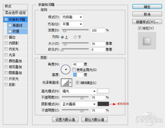 完成后双击“文本副本2”图层,调出“图层样式”,选择“斜面与浮雕”,取消“纹理”选项,设置斜面与浮雕的参数,如下所示
