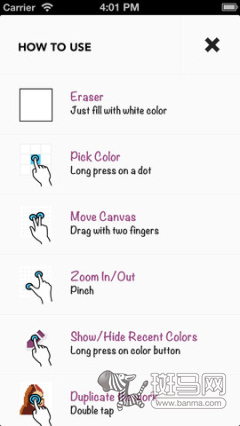 当然,如果你在创作时一点思路也没有,软件还提供了照片参考的功能,你可以从相册内导入一张图片,在界面中形成半透明的水印,用双指放大后根据背后图案的 颜色进行相应的填充即可。如果你是个艺术创作者,那么这款软件不应该错过,简单的操作,个性化的操作,处处都能体现出你的文艺风采。