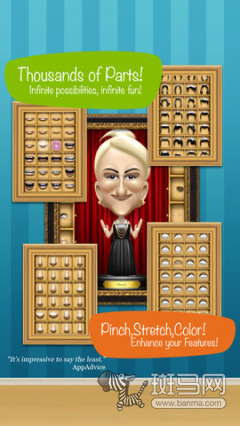 推荐理由:《Bobbleshop》可以帮助你制作出让人意想不到的个性头像。软件的内容相当丰富,从头发、眼睛、眉毛、鼻子、 嘴巴、脸型、动作等等,一个项目中包含了许多种选择。不仅能在通讯录中加入头像,众多明星的玩具造型也将在你的手里诞生。
