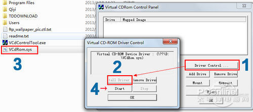 点击Install Drivers(安装驱动)——然后选择刚才复制到系统盘“drivers”文件夹下的“VCdRom.sys”文件,最后点击 Strat(开始),最后点击OK,完成虚拟光驱的驱动安装。