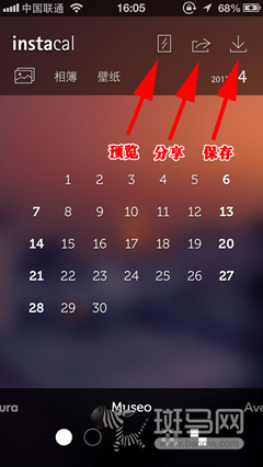 通过左上方的图标可以选择日历背景是使用应用内置壁纸或者是相册内照片,右上方的三个按钮分别是:预览,点击后会出现换好壁纸后的锁屏效果; 分享,可以将制作好的壁纸通过社交网络、邮件等方式分享;储存,将制作好的壁纸储存到手机的相册中,要想保存首先要在系统设置里(设置->隐私 ->照片)为《即刻日历》开启权限。