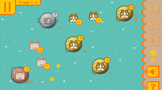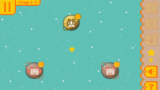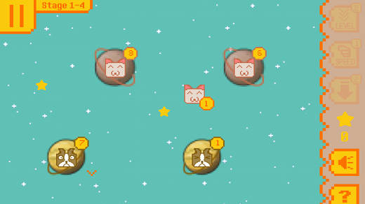 每个星球的右上角都会显示当前星球中汪星人或喵星人的数量,玩家需要将自喵星人拉到汪星人的星球上去占领它们的地盘,方法比较简单,点击喵星人的星球然后拖拽到汪星人的星球,每次派遣出的喵星人数量为当前星球部队数量的一半。如果你派遣部队的数量大于汪星人的数量,那就算是成功占领了。双方各自的星球在派遣的同时还会不断的生产出猫猫狗狗。