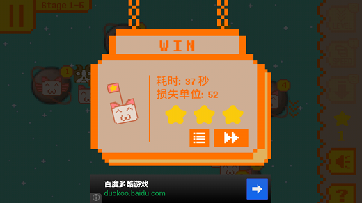 游戏中还能使用很多的技能来帮助喵星人获胜。如加快生产速度,加快派遣速度,减缓汪星人的生产速度。想要使用这些技能需要玩家派出喵星人来拾取太空中随机产生的星星,获得一定数量的星星就能够使用技能了。游戏中还能看到很多的中立星球,别忘了去占领它们来壮大自己的力量。最后会根据游戏用时的多少来为玩家评级。