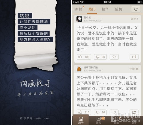 软件中的每条段子都有人气点评,用户无需注册即可与众多段子达人互动交流。同时,用户可以很方便地将内涵段子分享给各大社区的朋友,真正做到娱 乐同享。除此之外,软件还能通过用户的浏览习惯去辨别口味,并能够通过用户的口味去推断更多精彩的段子。即便你是个叱诧网络论坛多年的屌丝,在这其中肯定 也会有你看不懂的段子。