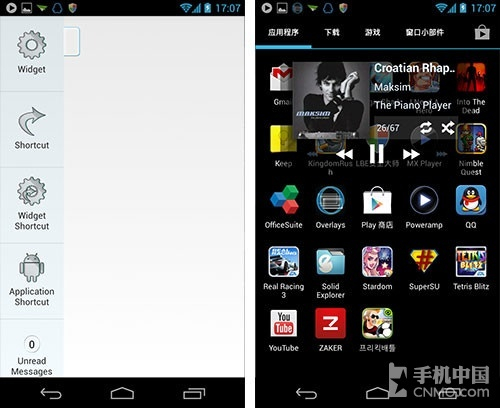 今天介绍的Overlays用一种很巧妙的方法解决了同屏多任务的难题,这个方法就是使用桌面插件,也就是说使用Overlays,你可以在现 有桌面的基础上再叠加一层桌面,这个桌面是用来放小插件的,背景桌面即使进入应用程序,桌面上的小插件也不会因此消失,比如你放个听歌的小插件,无论你在 哪个界面都可以切换歌曲。