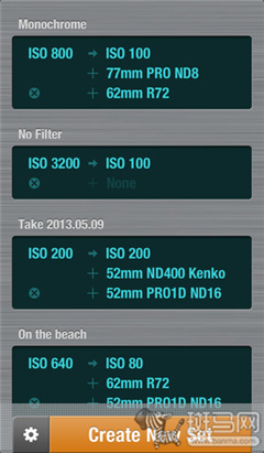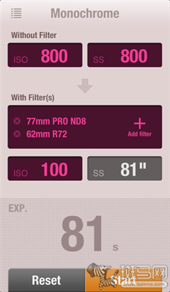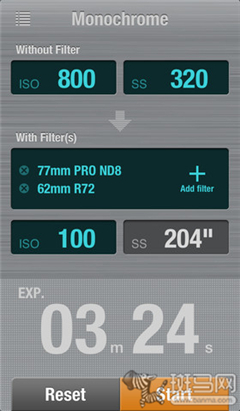 你只需在APP上输入机身测光提供的感光度和快门速度参数,再选择ND滤镜型号(最多可同时选择3块ND滤镜),《with ND》就会计算出使用ND滤镜后的正确拍摄参数。与《FotometerPro》一样,该软件也提供了计时器的功能。