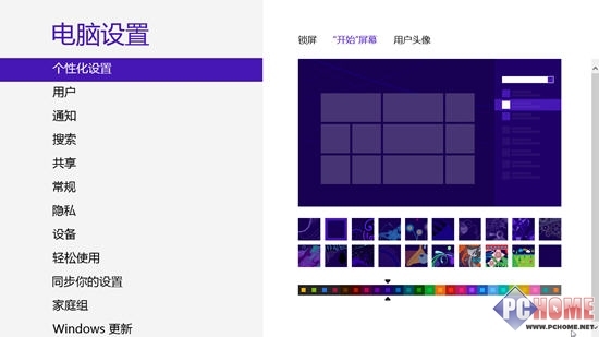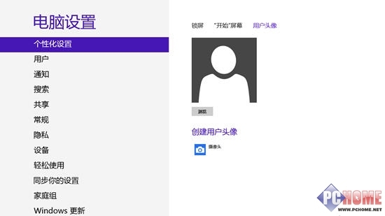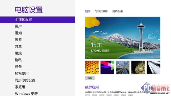 通过设置个性化桌面,来熟悉Win8操作系统,是个非常好的方法。鼠标移动到屏幕右侧,弹出charm bar,点击“设置”,再点击更改电脑设置,进入下图界面,右上角第一个选项可以让用户更换各种锁屏图片。