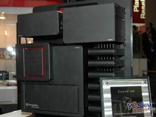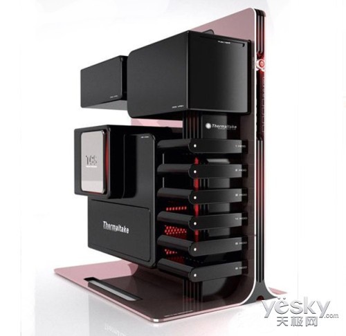 Level 10机箱一改传统机箱整体化的设计理念,将主板、电源、光驱和硬盘四大部分分别独立为各自的箱体,独立散热,并方便DIYer自行更换。所有电源、数据线全部从机箱背部走线,提供3个5寸光驱为,6个3.5寸硬盘位。