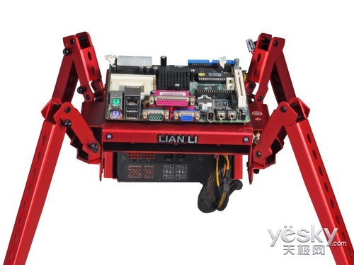 主板和电源是分别在两端的,中央的理线处很好的固定了电源线材,使其看上去更加的整齐一体。虽然只是应用的mini-ITX平台,但从安装后效果图来看,这款裸平台还是要占用些空间的,因为蜘蛛腿是完全伸展开的,喜欢的话也要为你的桌面留出地方来。