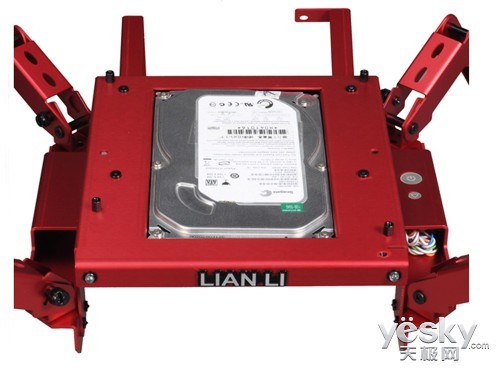 机箱顶端装载着一个超大的散热风扇,对于裸体机箱来说更加提高散热性能,Skeleton只有两个硬盘槽位,没错,但实际上它能装的硬盘多过其 它机箱。在硬盘上安装附件内提供的挂钩,可以直接将硬盘挂在侧面横梁上提供的众多方孔里,位置任意调整,操作过程易如反掌。挂钩内侧附有减震垫,不必顾虑 硬盘震动。