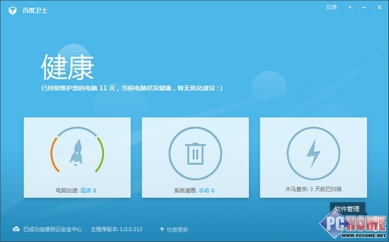 百度卫士主界面:电脑健康状态与四大系统服务!百度卫士采用实时更新健康状态的方式,开启后可以立即显示电脑健康状态。如果您的电脑状况不理想,百度卫士 会显示您的电脑状态为“亚健康”,并告知您需要被优化的项目。点击“一键优化”,便可快速优化所有项目,使您的电脑达到健康状态!您还可以通过电脑加速、 系统清理、木马查杀和软件管理四大服务精确地优化电脑各项问题。