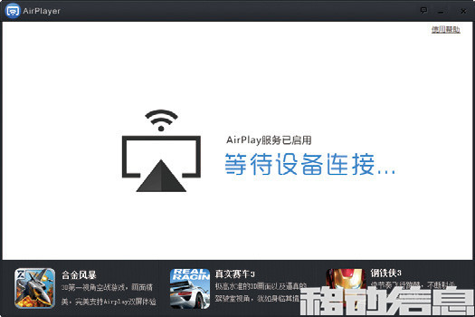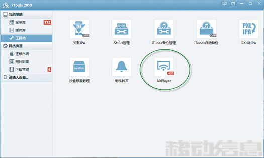 注意,只有从《iTools》0427版本开始才有AirPlay功能,如果发现你的《iTools》没有AirPlay,那一定是你的版本太老,可以到官方网站下载一个最新版本的。