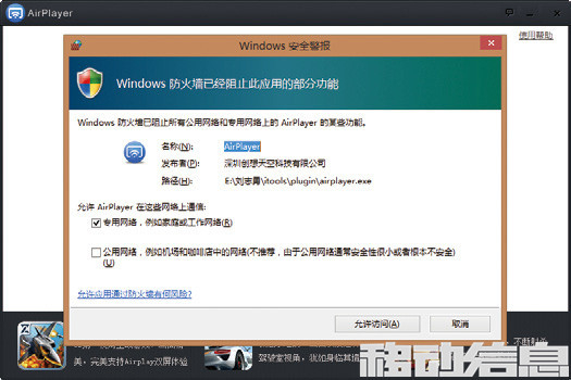打开《iTools》,点击左侧的《我的电脑》→工具箱,在右侧找到AirPlayer。在第一次运行时会下载AirPlayer,如果开启了 Windows自带的防火墙,会出现安全警报。点击允许访问按钮,才可以正常使用。AirPlay的PC端,无需任何设置,据《iTools》消息,以后 会支持全屏等特性。它固定在前台显示,你可以最小化到系统托盘。