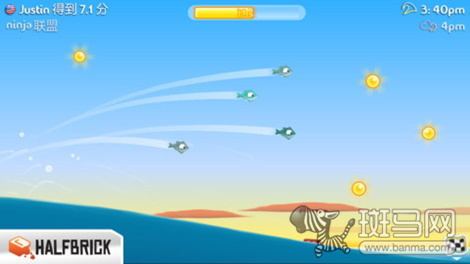 由切水果家出品的一款抛物线题材的新游,我们往外扔的物体不是愤怒的小鸟,而是非常可爱的小鱼鱼,一共有6只不同的哦,在每一轮游戏中,可以选择六条鱼中的任意三条,帮助它们起飞,看看谁抛的最远。