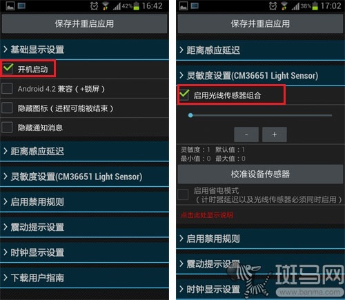 进入《智能锁屏》的设置页面,在“基础显示设置”中,勾选“开机启动”。如果是安卓4.2系统,则将“Android 4.2兼容(+锁屏)”的选项同样勾选上。之后在“灵敏度设置”选项中,勾选“启用光线传感器组合”。完成如上设置,当我们将手机装入口袋中的时候,手机 就会自动关闭屏幕;期间如果按动手机的电源按钮或其他可以唤醒屏幕的操作,都会在第一时间内自动关闭屏幕,从而断绝口袋中大腿误操作的可能。
