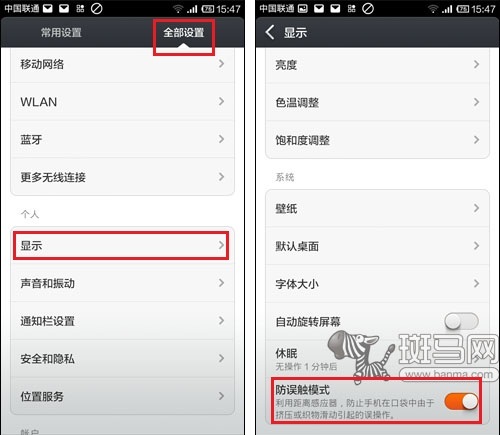 以MIUI V5为例,在系统设置的“全部设置”页中,点击“显示”选项,然后打开下级菜单中最下方的“防误触模式”即可。